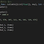 17 // 10 = 1-17 // 10 = -2 17 % 10 = 7-17 % 10 = 317 % -10 = -3차이점 알아두기 TDD = 테스트 주도 개발(Test-driven development)람다식 def add(a,b): return a+badd(1,2)3람다식으로 변환하면add = lambda a, b: a+badd (1,2)3 def calculator(a,b): return a+b, a-b, a*b, a람다식으로 변환하면calculator = lambda a,b : (a+b, a-b, a*b, a/b)코드가 훨씬 간결해짐 (클린코드) 새로운 함수 디자인>>> 함수명(인자값)을 작성하여 밑에 예상 결과값을 작성한다.def 함수명(인자값: 자료형) → 자료형: 으로 함수를 작성한다.'''로 ..